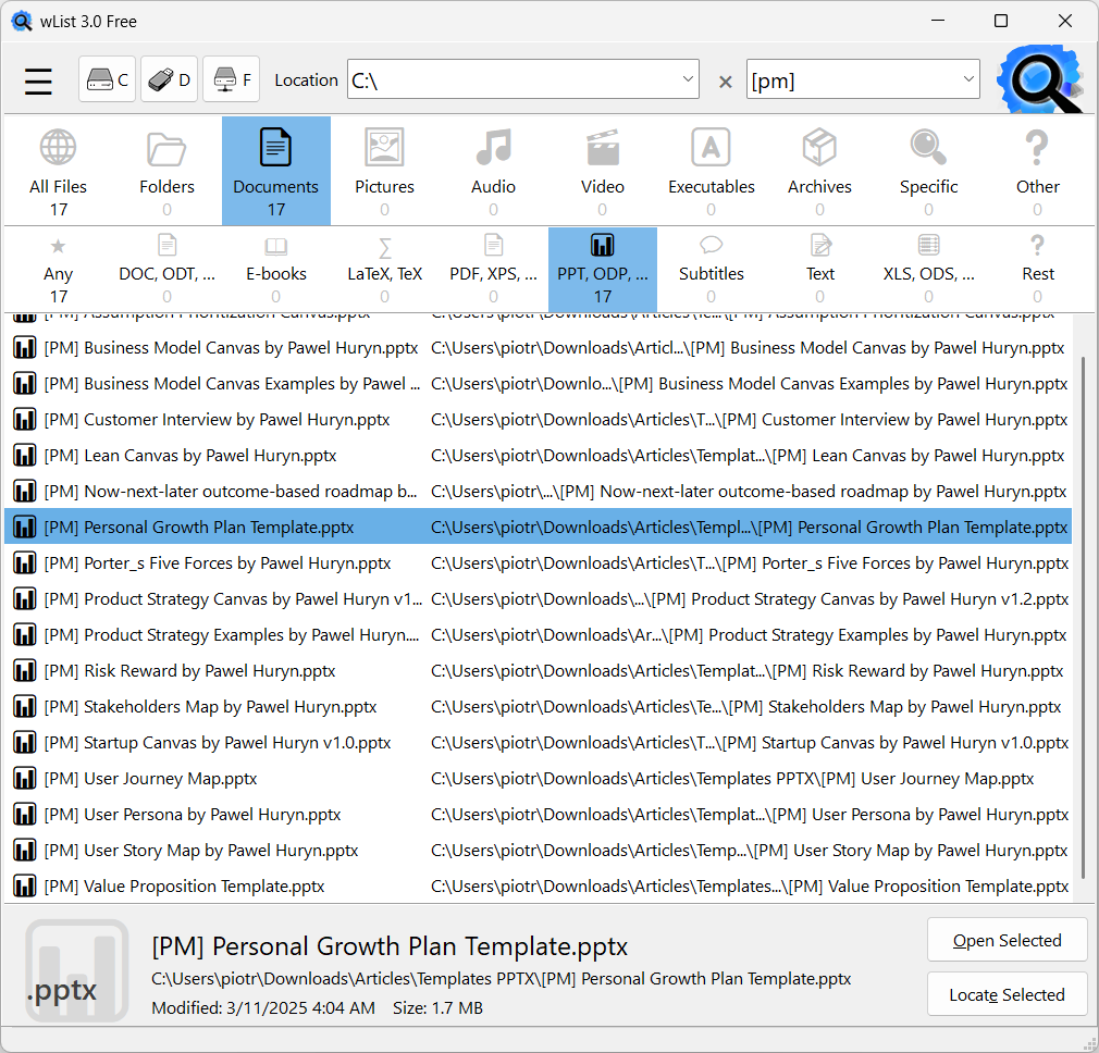 Stop waiting for search results. wList provides super-fast file searching across local and network locations thanks to intelligent caching. Easily find what you need by using meaningful categories like Audio, Video, Documents, and Archives. You can instantly create lists of files and folders. Access any file or folder directly from the results. National characters are supported. Manage your files with wList.