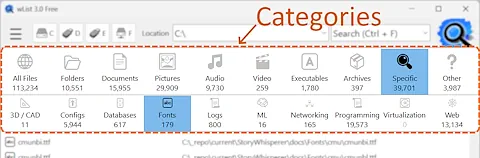 Efektywność jest wbudowana w interfejs wList. Możesz łatwo zawęzić zakres wyszukiwania, aby wyszukiwać tylko konkretne dokumenty lub media, korzystając z 10 głównych kategorii i 49 specjalistycznych podkategorii. Ta wszechstronność sprawia, że jest to najlepsze narzędzie do wyszukiwania dokumentów i drukowania zawartości katalogów. Możesz natychmiast filtrować wyniki, a nawet otwierać pliki lub zawierające je foldery bezpośrednio z aplikacji za pomocą prostego dwukrotnego kliknięcia. To najwydajniejsze narzędzie „dir w oknie” dostępne obecnie dla użytkowników systemu Windows. Popularne kategorie plików obejmują:
