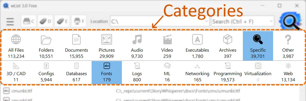 Efficiency isn't just about speed; it is about finding exactly what matters to you. To help you focus, wList features smart categories, acting as your dedicated document finder, photo locator, and media helper all in one. With 10 major categories and 49 specialized sub-categories, it is the most versatile file lister available today. By grouping your results into helpful categories, we streamline your workflow and eliminate the need to scroll through unrelated system files.