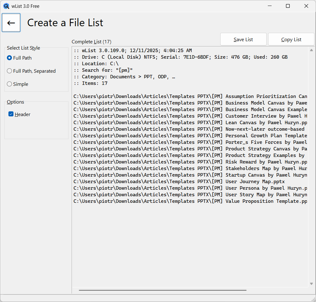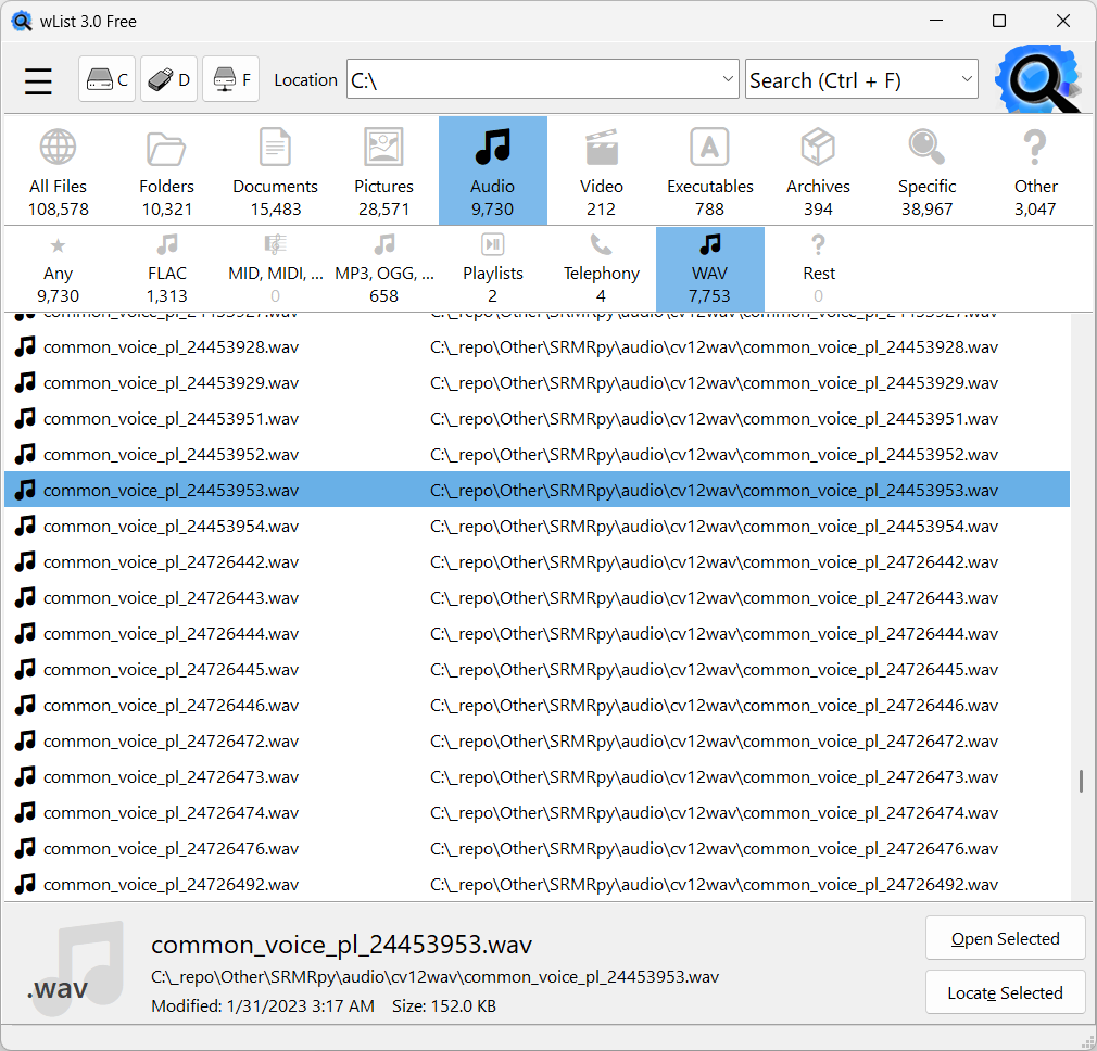 Stop waiting for search results. wList provides super-fast file searching across local and network locations thanks to intelligent caching. Easily find what you need by using meaningful categories like Audio, Video, Documents, and Archives. You can instantly create lists of files and folders. Access any file or folder directly from the results. National characters are supported. Manage your files with wList.